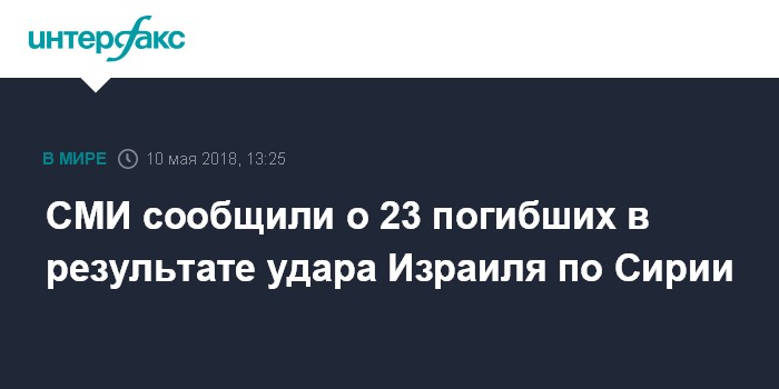 Москва. 10 мая. INTERFAX.RU - В результате ударов Израиля по нескольким объектам в Сирии погибли 23 военных и ополченца. Об этом сообщают западные СМИ со ссылкой на близких к сирийской оппозиции очевидцев.