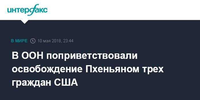 Москва. 10 мая. INTERFAX.RU - В ООН приветствуют освобождение из заключения в Северной Корее трех американских граждан и призывают Пхеньян освободить также других иностранцев, арестованных в последние годы в КНДР.