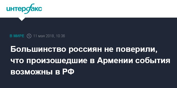 Около 80% россиян, интересующихся происходящим в Армении, склонны считать, что подобные события в России исключены, сообщили в ВЦИОМ. "В России события, подобные тем, что мы наблюдаем в Армении, более трех четвертей россиян, следящих за ситуацией (78%), считают в настоящее время невозможными. Подобную вероятность допускают только 15% (эта доля заметно выше средневыборочной в группе 18-24-летних - 30%)", - отмечается в данных по результатам опроса.