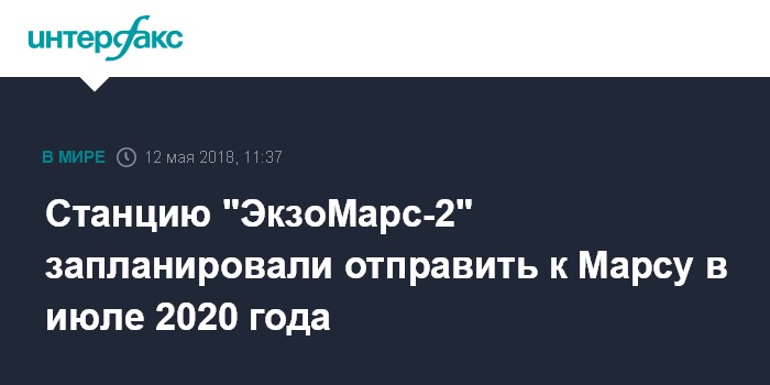 Москва. 12 мая. INTERFAX.RU - Вторая международная миссия "ЭкзоМарс" отправится к "красной планете" летом 2020 года с российского космодрома, сообщил в субботу "Интерфаксу" источник в ракетно-космической отрасли.