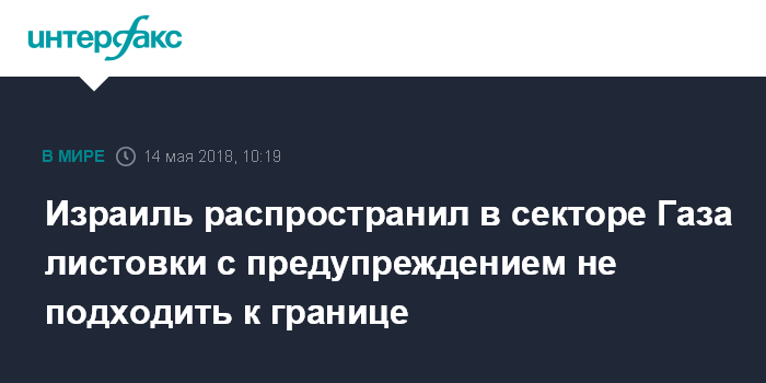Москва. 14 мая. INTERFAX.RU - Армия обороны Израиля через листовки призывает жителей сектора Газа не приближаться к границе и не вступать в столкновения с израильскими военными, сообщает в понедельник газета The Jerusalem Post.