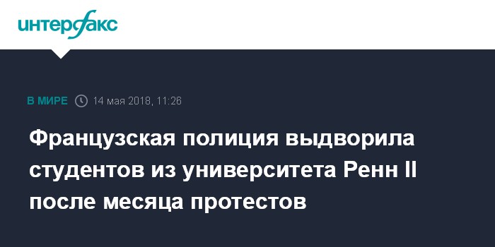 Москва. 14 мая. INTERFAX.RU - Французские полицейские в понедельник разогнали группу студентов, которые уже больше месяца протестуют против реформы высшего образования, в университете Ренн II, расположенном в одноименном городе на западе Франции, пишет газета Le Figaro.