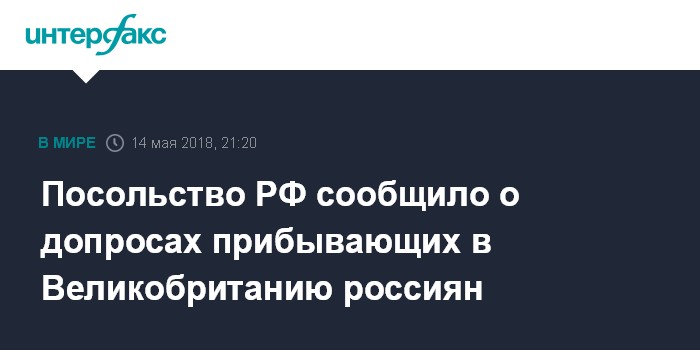 Москва. 14 мая. INTERFAX.RU - В посольстве России в Лондоне сообщили о задержаниях и допросах сотрудниками силовых структур Великобритании российских граждан, прилетающих в эту страну.