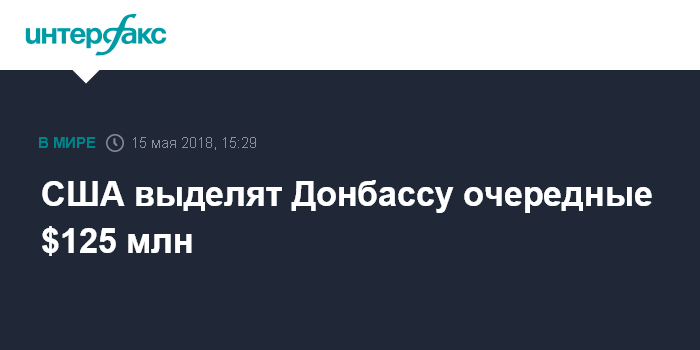 Москва. 15 мая. INTERFAX.RU - Соединенные Штаты предоставят дополнительную помощь в $125 млн для Донбасса и "соседних" территорий, сообщил заместитель администратора и руководителя USAID по делам стран Европы и Евразии Брок Бирман.