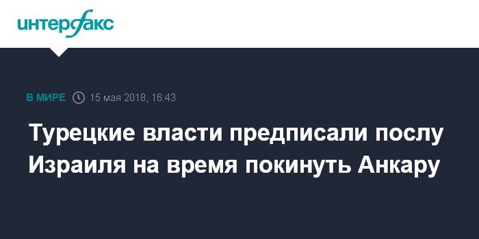 Москва. 15 мая. INTERFAX.RU - МИД Турции предписал послу Израиля покинуть страну "на некоторое время" в связи с гибелью на этой неделе десятков палестинских протестующих на границе сектора Газа, сообщает во вторник телеканал Sky News.