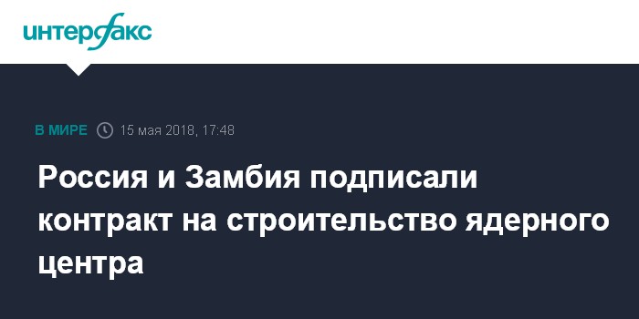 Москва. 15 мая. INTERFAX.RU - ГК "Росатом" и министерство высшего образования Замбии заключили контракт на проектирование, поставку и сооружение центра ядерной науки и технологий в Замбии. Об этом сообщил корреспондент "Интерфакса" с церемонии подписания в рамках "Атомэкспо-2018".
