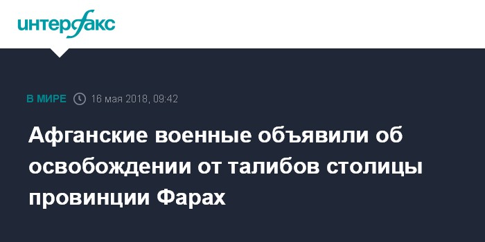 Москва. 16 мая. INTERFAX.RU - Город Фарах, административный центр одноименной провинции на западе Афганистана, полностью очищен от вооруженных боевиков радикального движения "Талибан" (запрещено в РФ), объявило в среду Министерство обороны страны.