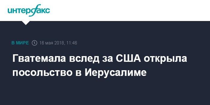 Москва. 16 мая. INTERFAX.RU - Церемония открытия посольства Гватемалы в Иерусалиме состоялась в среду - два дня спустя после того, как США завершили перенос своего посольства из Тель-Авива в Иерусалим, сообщает Jerusalem Post.