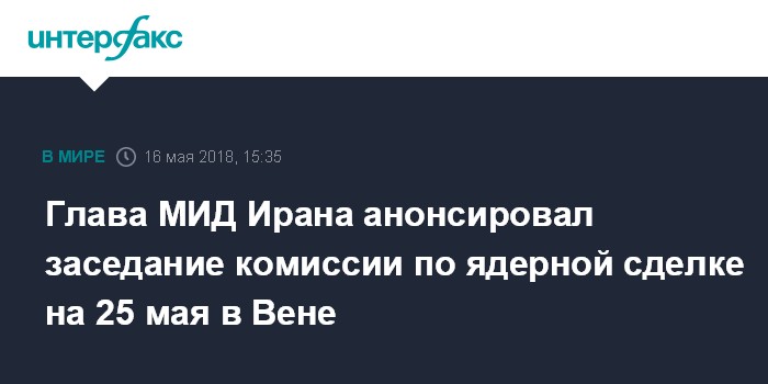 Москва. 16 мая. INTERFAX.RU - Глава МИД Ирана Джавад Зариф в среду объявил, что следующее заседание комиссии по Совместному всеобъемлющему плану действий (СВПД) пройдет в Вене 25 мая без участия США, сообщает агентство "Тасним".