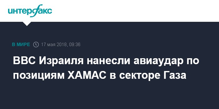 Москва. 17 мая. INTERFAX.RU - Израильские ВВС в ночь на четверг нанесли удар по позициям боевиков ХАМАС после того, как по израильским военнослужащим была открыта стрельба с территории сектора Газа, сообщила армия обороны Израиля.