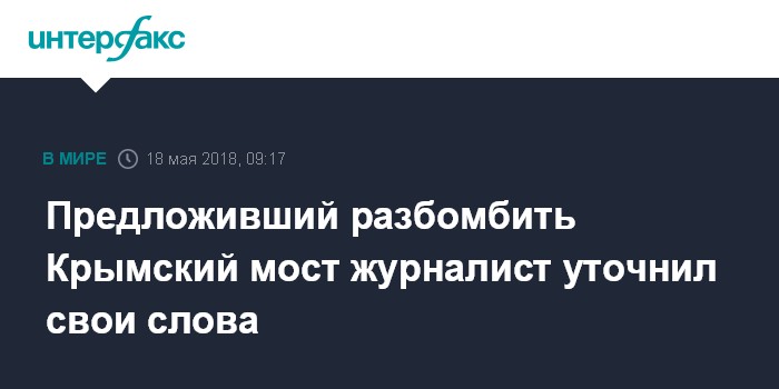 Москва. 18 мая. INTERFAX.RU - Журналист Washington Examiner Том Роган, призвавший ранее в своей статье разбомбить Крымский мост, уточнил в новой статье, что предлагал уничтожить мост без жертв.