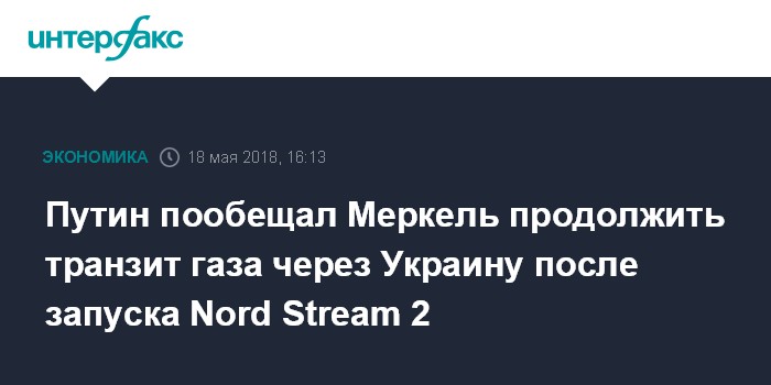 Москва. 18 мая. INTERFAX.RU - Транзит российского газа через Украину будет продолжен после запуска Nord Stream 2 ("Северный поток 2"), если это будет экономически целесообразно, заявил президент РФ Владимир Путин.