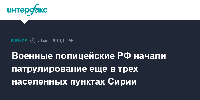 Москва. 20 мая. INTERFAX.RU - Подразделения российской военной полиции начали патрулировать сирийские населенные пункты Ялда, Бабилла и Бейт-Сахм, сообщил начальник российского центра по примирению враждующих сторон в Сирии генерал-майор Юрий Евтушенко.