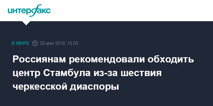 "На вечер 21 мая организацией черкесской диаспоры Турции ЧеркесФед в центральной части Стамбула на проспекте Истикляль запланировано проведение антироссийской демонстрации. Гражданам России следует избегать посещения проспекта Истикляль и прилегающих районов", - сообщает ситуационно-кризисный центр МИД РФ (ДСКЦ) в воскресенье.
