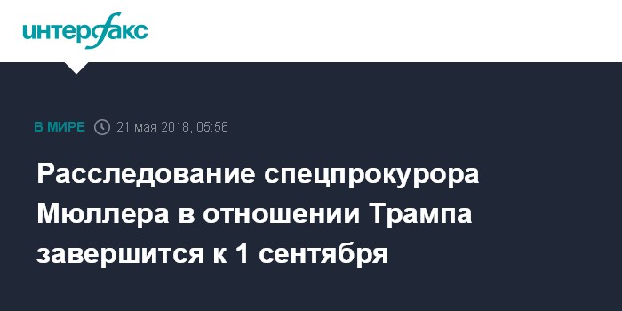 Москва. 21 мая. INTERFAX.RU - Расследование спецпрокурора Роберта Мюллера в отношении президента США Дональда Трампа должно завершиться к 1 сентября, пишет в воскреенье газета New York Times со ссылкой на юриста Белого дома Рудольфа Джулиани.