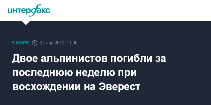 Москва. 21 мая. INTERFAX.RU - Двое альпинистов погибли при попытке покорить Эверест, сообщает Associated Press со ссылкой на данные властей Непала.
