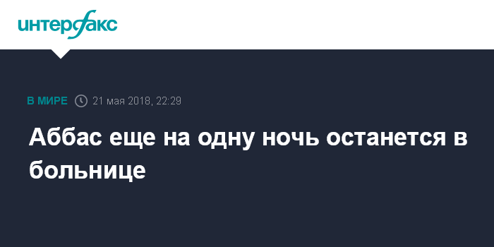 Москва. 21 мая. INTERFAX.RU - Глава Палестинской национальной администрации (ПНА) Махмуд Аббас останется в больнице по крайней мере еще на одну ночь, сообщают в понедельник западные СМИ со ссылкой на высокопоставленного палестинского чиновника.
