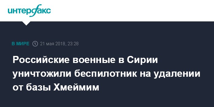 "21 мая c наступлением тёмного времени суток средствами контроля воздушного пространства российской авиабазы "Хмеймим" на удалении от аэродрома была обнаружена малоразмерная воздушная цель неизвестной принадлежности (БПЛА, беспилотный летательный аппарат). Штатными зенитными огневыми средствами российской авиабазы воздушная цель была уничтожена", - сказал в понедельник представитель российской авиабазы Хмеймим.