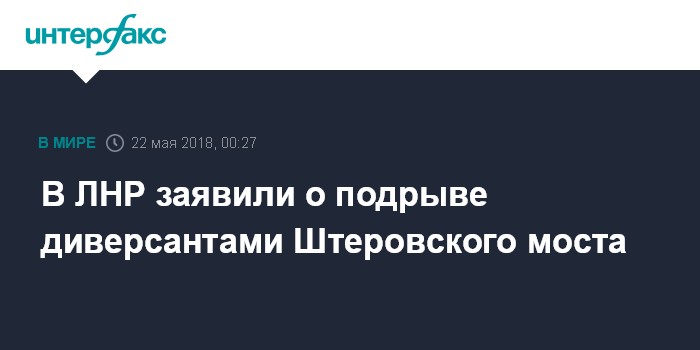Москва. 22 мая. INTERFAX.RU - Министерство государственной безопасности (МГБ) самопровозглашенной Луганской народной республики (ЛНР) заявляет о подрыве диверсантами автомобильного моста на 50-м километре трассы "Красный Луч - Луганск", в результате подрыва моста между городами нарушено транспортное сообщение.