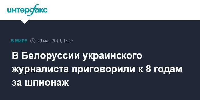 Москва. 23 мая. INTERFAX.RU - Обвиненный в Белоруссии в шпионаже украинский журналист Павел Шаройко приговорен к более чем восьми годам лишения свободы, сообщил в среду посол Украины в Минске Игорь Кизим.