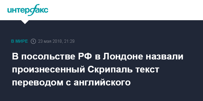 Москва. 23 мая. INTERFAX.RU - Текст, который Юлия Скрипаль произносит в видеообращении, был переводом с английского, оригинал был написан носителем языка, заявили в среду в посольстве РФ в Великобритании.