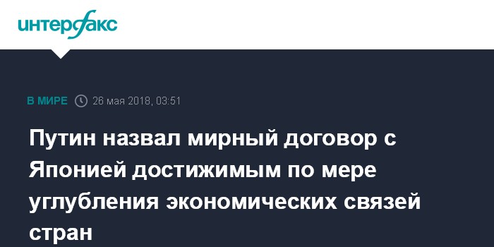 Москва. 26 мая. INTERFAX.RU - Мирный договор с Японией становится возможным по мере того, как укрепляются экономические связи, заявил президент РФ Владимир Путин на встрече с руководителями международных информагентств, среди которых присутствовал главный редактор Kyodo News (Япония) Хироки Сугита.