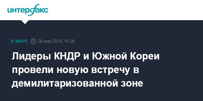 Москва. 26 мая. INTERFAX.RU - Лидеры КНДР и Южной Кореи, Ким Чен Ын и Мун Чжэ Ин, провели в субботу встречу в демилитаризованной зоне, сообщает агентство "Ренхап" со ссылкой на заявление канцелярии главы южнокорейского государства.