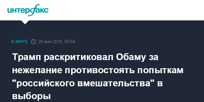 Москва. 28 мая. INTERFAX.RU - Президент США Дональд Трамп предположил, что его предшественник на посту главы государства Барак Обама не предпринимал мер по защите от предполагаемых попыток российского вмешательства в американские выборы, так как верил в победу Хиллари Клинтон.