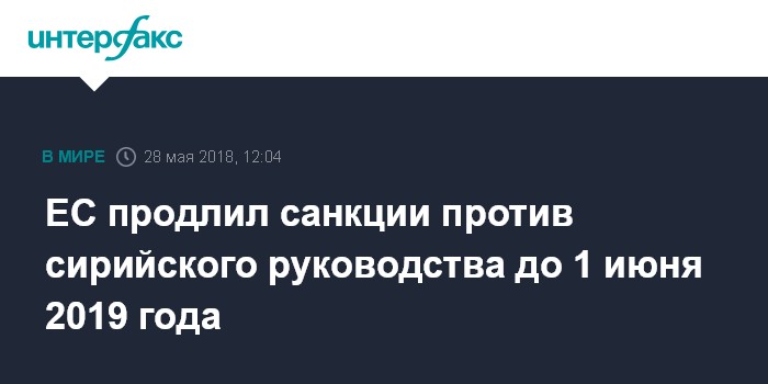Москва. 28 мая. INTERFAX.RU - Власти ЕС приняли решение о продлении санкций в отношении правительства Сирии до 1 июня 2019 года, говорится в заявлении Совета ЕС по иностранным делам.
