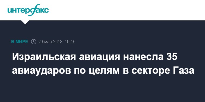 Москва. 29 мая. INTERFAX.RU - ВВС Израиля во вторник осуществили 35 авиаударов по семи целям, расположенным на территории сектора Газа, в ответ на ракетные обстрелы Израиля из этого района, сообщает сайт издания The Times of Israel со ссылкой на заявление израильских военных.