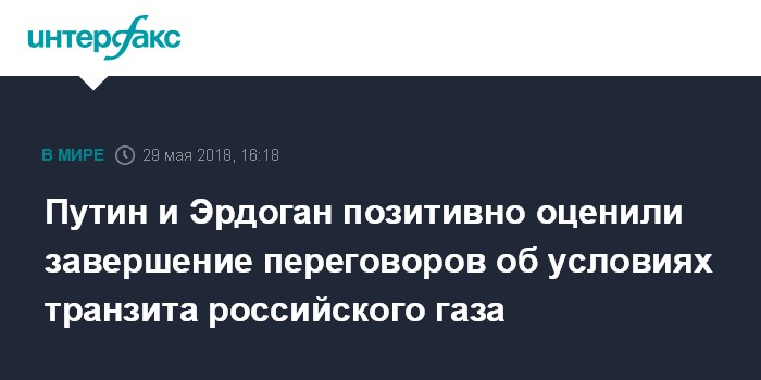 Москва. 29 мая. INTERFAX.RU - Президенты РФ и Турции Владимир Путин и Реджеп Тайип Эрдоган дали позитивную оценку успешному завершению переговоров об условиях транзита по турецкой территории российского газа b подтвердили настрой на укрепление партнерства, сообщает во вторник пресс-служба Кремля.