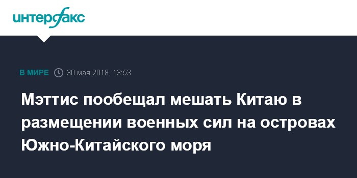 Москва. 30 мая. INTERFAX.RU - Шеф Пентагона Джеймс Мэттис заявил, что США будут принимать меры против милитаризации КНР искусственных островов в зоне Южно-Китайского моря, которые является предметом территориального спора между несколькими странами.