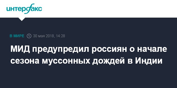 Москва. 30 мая. INTERFAX.RU - В Индии начался сезон муссонных дождей, из-за сильных ливней погибли десятки человек, сообщили в среду в ситуационно-кризисном центре МИД РФ (ДСКЦ).