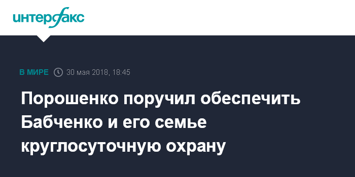 Москва. 30 мая. INTERFAX.RU - Президент Украины Петр Порошенко поздравил Службу безопасности Украины с операцией по сохранению жизни российскому журналисту Аркадию Бабченко и поручил обеспечить ему и его семье круглосуточную охрану.