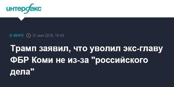Москва. 31 мая. INTERFAX.RU - Президент США Дональд Трамп заявил в четверг, что уволил бывшего главу Федерального бюро расследований Джеймса Коми не из-за того, что тот расследовал предположительный сговор его предвыборного штаба с Москвой.