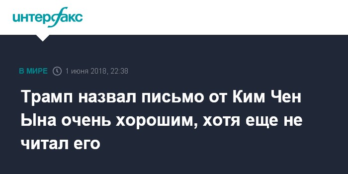 Москва. 1 июня. INTERFAX.RU - Президент США Дональд Трамп в пятницу назвал письмо от северокорейского лидера Ким Чен Ына очень интересным и хорошим, но признался, что пока не открывал его.
