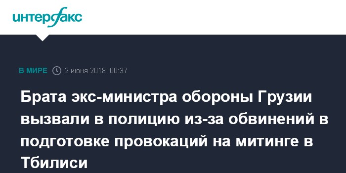 Москва. 2 июня. INTERFAX.RU - В МВД Грузии в пятницу вызвали брата бывшего министра обороны Тины Хидашели в связи с информацией организаторов митинга в Тбилиси о том, что на акции возможны серьезные провокации.