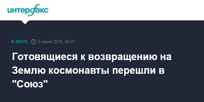 Москва. 3 июня. INTERFAX.RU - Участники экспедиции МКС-54/55 перешли в корабль "Союз МС-07", сообщает пресс-служба госкорпорации "Роскосмос".