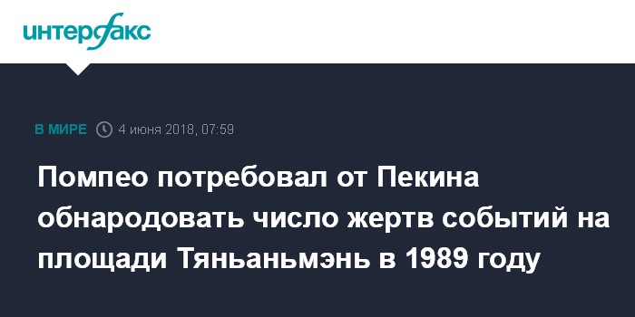 Москва. 4 июня. INTERFAX.RU - Госсекретарь США Майк Помпео потребовал от китайских властей официально сообщить о числе погибших и пострадавших в результате разгона демонстрантов на пекинской площади Тяньаньмэнь 4 июня 1989 года.