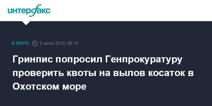 Москва. 5 июня. INTERFAX.RU - Гринпис России считает незаконным одобрение Росприроднадзором квот на вылов 13 косаток в Охотском море и просит генеральную прокуратуру провести проверку.