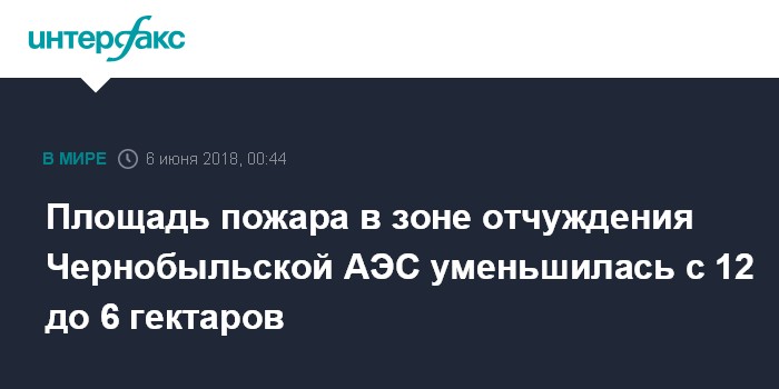 Москва. 6 июня. INTERFAX.RU - Сотрудники Госслужбы по чрезвычайным ситуациям (ГСЧС) Украины приостановили распространение пожара в зоне отчуждения и безусловного (обязательного) отселения Чернобыльской АЭС, площадь пожара уменьшилась до 6 гектаров, сообщили в ГСЧС.