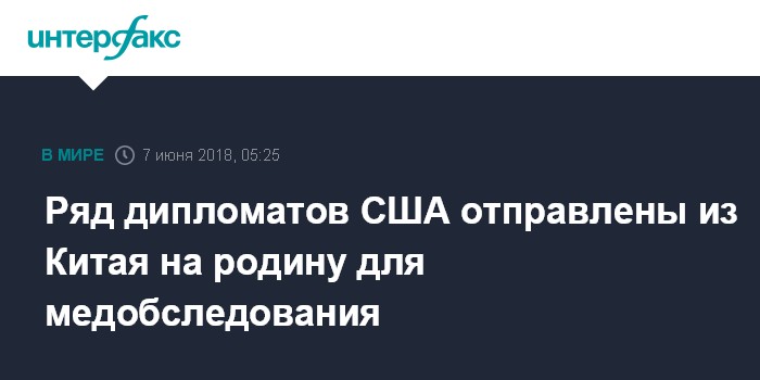 Москва. 7 июня. INTERFAX.RU - Несколько сотрудников генконсульства США в китайском городе Гуанчжоу (южная провинция Гуандун) и членов их семей были отправлены на родину для прохождения медицинского освидетельствования, сообщила представитель американского госдепартамента Хизер Нойерт.