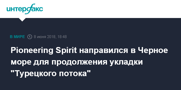 Москва. 8 июня. INTERFAX.RU - Трубоукладочное судно Pioneering Spirit в пятницу вышло из порта Роттердама и в настоящее время направляется в Черное море, говорится в сообщении компании South Stream Transport B.V. - заказчика стройки.