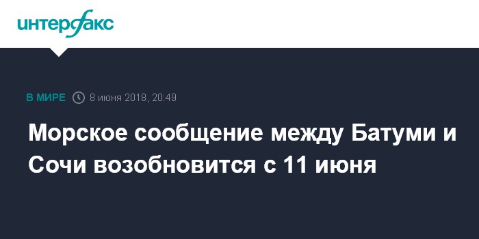 Москва. 8 июня. INTERFAX.RU - Грузинская компания "Экспресс Батуми" со следующего понедельника возобновляет морское сообщение между Батуми и Сочи, которое будет осуществляться в течение всего летнего сезона на быстроходном судне на подводных крыльях "Комета", сообщил в пятницу "Интерфаксу" директор компании Зураб Кирцхалия.