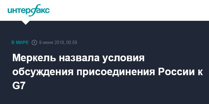 Москва. 9 июня. INTERFAX.RU - Канцлер Германии Ангела Меркель считает, что говорить о возвращении России в состав "Группы семи" можно будет после того, как будет достигнут существенный прогресс в ситуации на Украине.