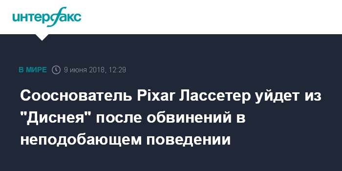 Москва. 9 июня. INTERFAX.RU - Один из сооснователей анимационной киностудии Pixar, режиссер Джон Лассетер покинет компанию "Дисней" после серии обвинений в неподобающем поведении, сообщает The Independent.