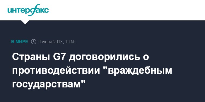 Москва. 9 июня. INTERFAX.RU - Лидеры стран G7 на саммите в Канаде договорились о создании нового совместного механизма реагирования на злонамеренные действия "враждебных государств", говорится в субботу в пресс-релизе правительства Великобритании.