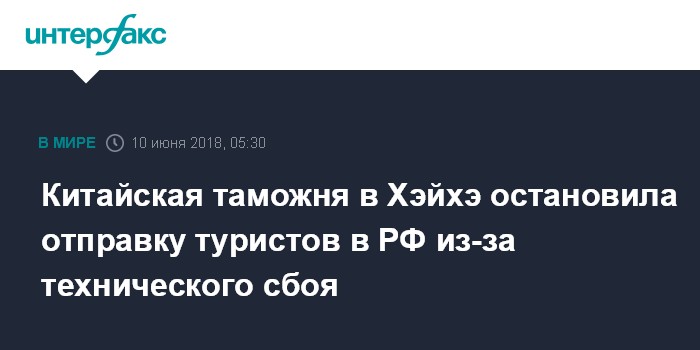 Москва. 10 июня. INTERFAX.RU - Туристический поток на участке российско-китайской границы Благовещенск - Хэйхэ приостановлен в воскресенье из-за технического сбоя на китайском пункте пропуска. Министерство внешнеэкономических связей, туризма и предпринимательства Амурской области сообщает, что власти региона ждут официальных комментариев от народного правительства Хэйхэ.
