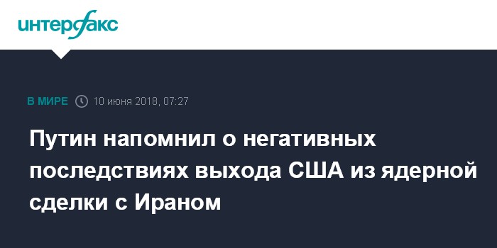 Москва. 10 июня. INTERFAX.RU - Выход США из Совместного и всеобъемлющего плана действий (СВПД) негативно влияет на стабильность в регионе, заявил президент РФ Владимир Путин в ходе саммита ШОС.