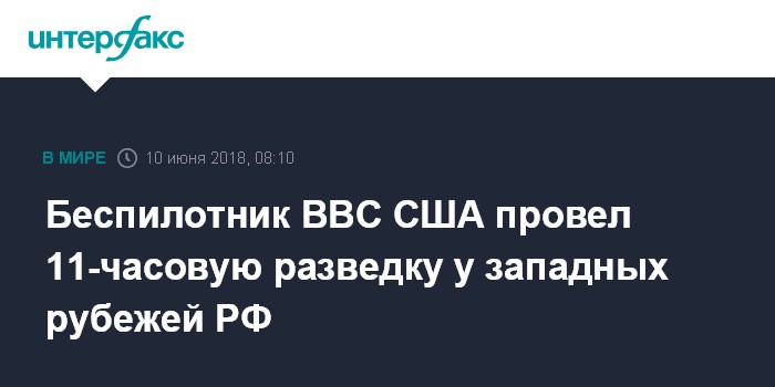 Москва. 10 июня. INTERFAX.RU - Стратегический беспилотный летательный аппарат ВВС США RQ-4B Global Hawk, способный вести разведку на большую глубину территории противника, в субботу совершил очередной многочасовой полет вблизи границ России в регионе Балтики, следует из мониторинговых данных западных авиационных ресурсов.